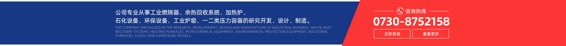 公司專業(yè)從事工業(yè)燃燒器及其智能化控制系統(tǒng)、余熱回收系統(tǒng)、加熱爐及各類爐配件、石化設(shè)備及配件、環(huán)保設(shè)備、工業(yè)爐窯及其輔助設(shè)備配件、一二類壓力容器的研究開發(fā)、設(shè)計(jì)、制造。